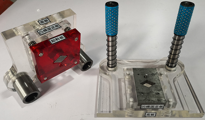 把板材料沿直線彎成各種形狀,可以加工形狀較復(fù)雜的零件。 以菱形工件作為導(dǎo)料,彎曲高度不小于10 mm,產(chǎn)品自動(dòng)從凸模脫落。 |