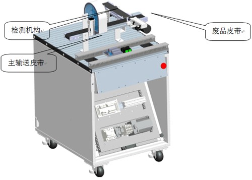 主皮帶運(yùn)行,接收上一站擰好蓋后的物料瓶子,當(dāng)物料瓶經(jīng)過檢測(cè)機(jī)構(gòu)時(shí):回歸反射傳感器檢測(cè)瓶蓋是否擰緊;檢測(cè)機(jī)構(gòu)檢測(cè)瓶子內(nèi)部顆粒是否符合要求;對(duì)擰蓋與顆粒均合格的瓶子進(jìn)行瓶蓋顏色判別區(qū)分;擰蓋或顆粒不合格的瓶子被分揀機(jī)構(gòu)推送到廢品皮帶上(短皮帶);擰蓋與顆粒均合格的瓶子被輸送到皮帶末端,等待機(jī)器人搬運(yùn)。